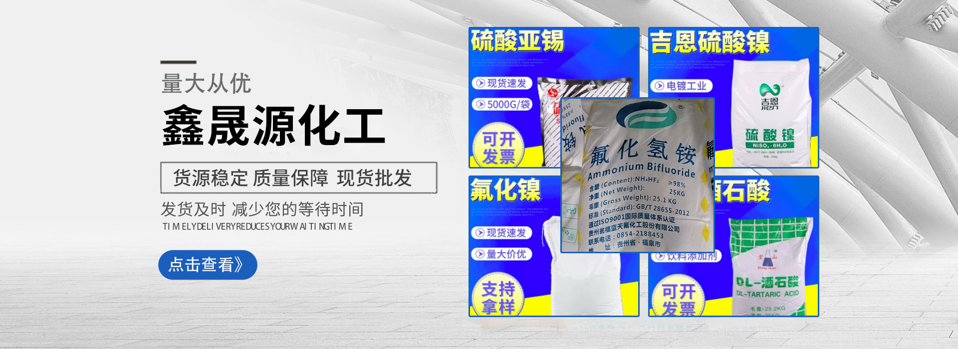 臨沂鑫晟源化工有限公司主要經(jīng)營(yíng)硫酸亞錫,硫酸鎳,氟化鎳,醋酸鎳,酒石酸,氟化氫銨,氟化銨,硫酸聯(lián)氨,硼酸,檸檬酸,氫氟酸,磷酸,硝酸,片堿,氨水,鄰/對(duì)苯二酚,聚丙稀酰胺,聚合氯化鋁,氟鋯酸銨,硫酸銅等化工產(chǎn)品,并且與多家制造商和代理商建立了長(zhǎng)期穩(wěn)定的合作關(guān)系。 臨沂鑫晟源化工有限公司品種齊全,價(jià)格合理。 公司以強(qiáng)大的信譽(yù),重合同,產(chǎn)品質(zhì)量保證,多元化經(jīng)營(yíng)特色,薄利多銷(xiāo)的原則贏(yíng)得了客戶(hù)的信賴(lài)。我們以“誠(chéng)信、團(tuán)結(jié)、創(chuàng)新、進(jìn)取”為經(jīng)營(yíng)精神,可靠?!百|(zhì)量和優(yōu)質(zhì)服務(wù)”是我們對(duì)每一位客戶(hù)的承諾,我們始終致力于為客戶(hù)提供他們需要的可靠產(chǎn)品和質(zhì)量服務(wù)。 “雙贏(yíng)合作”是我們與客戶(hù)達(dá)成的目標(biāo)。精細(xì)化學(xué)品以及客戶(hù)定制的產(chǎn)品。超…